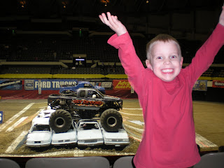 As I mentioned in my earlier post, Gerald took Lucas to Monster Jam last night. It didn't go quite as Gerald had hoped. Lucas didn't freak out or get upset about the noise, he just decided it was time to go home after about half an hour into the show. Gerald was a little bummed, but didn't want to make him stay and have him never wanting to go back, so they left. Gerald thinks it was just too much for our little guy to take in all at once. That, and the earplugs he had weren't fitting in his ears very well, so it was probably quite loud. None of our kids are fond of really loud noises. Lucas must have really enjoyed the little bit he did see though, because he talks about it a lot and acts like a monster truck constantly! I really love the picture Gerald got of him though. If you know Lucas, you know that this picture is worth a thousand words!